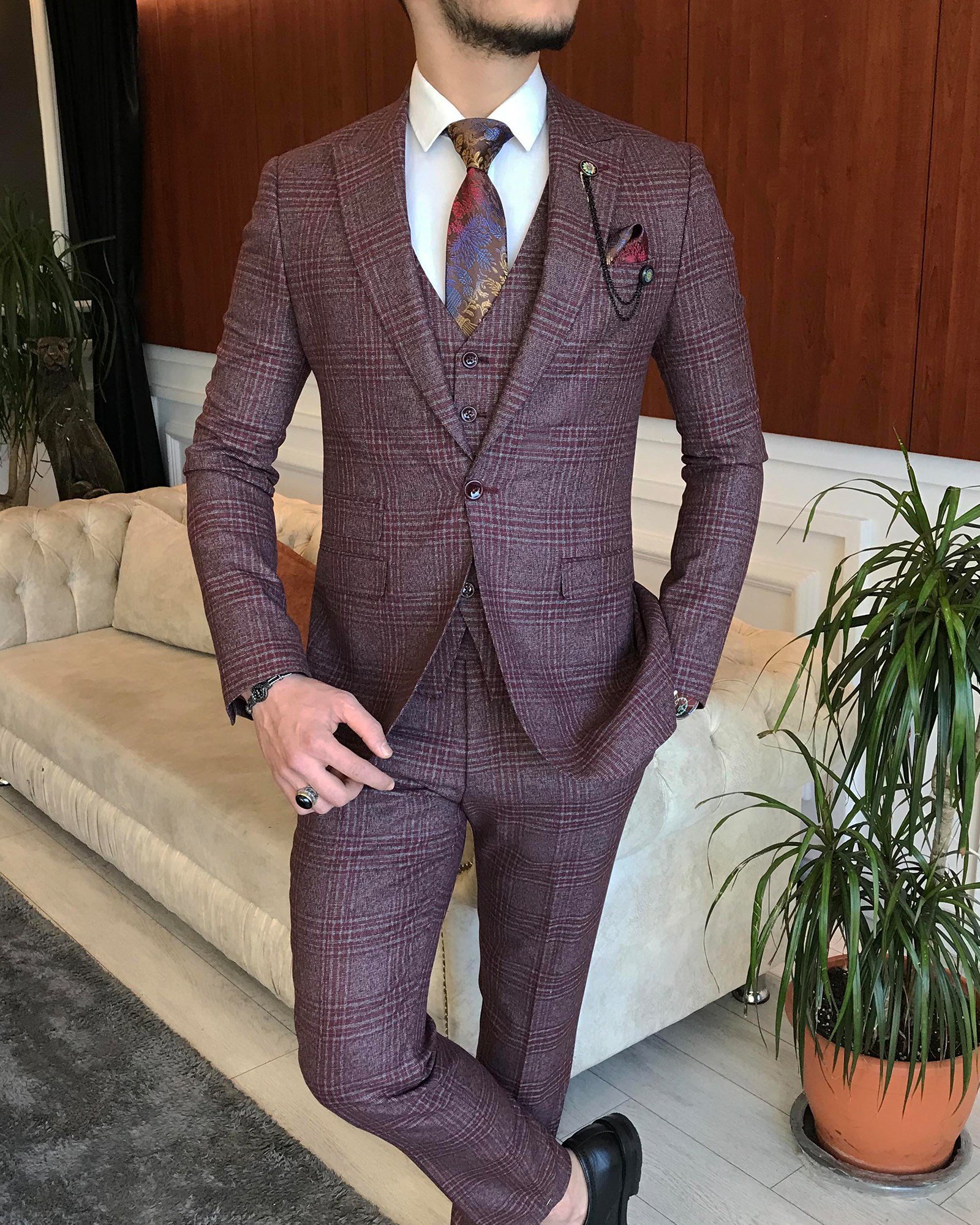 İtalyan stil ekose ceket yelek pantolon takım elbise bordo T6999