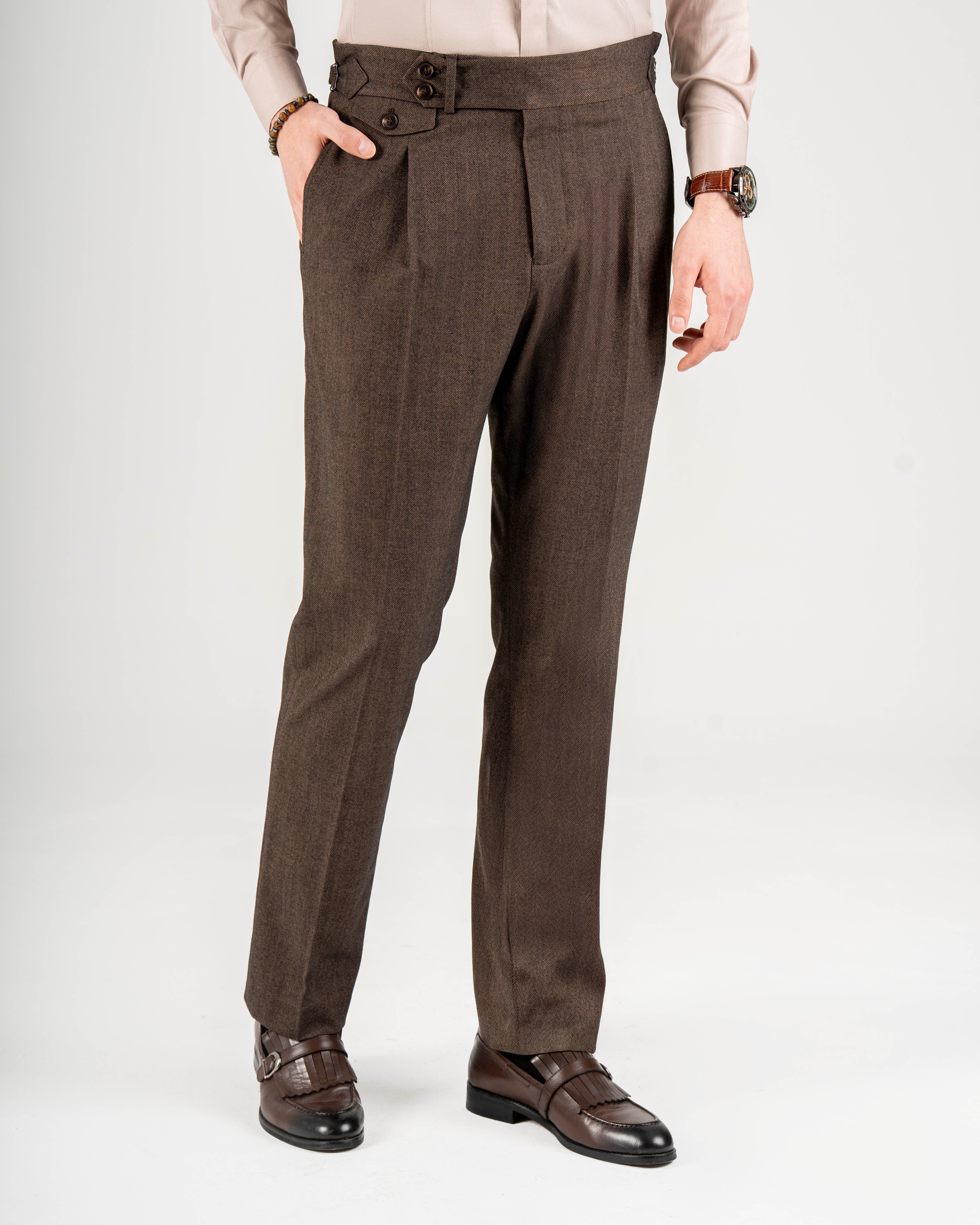 İtalyan stil slim fit bel detaylı erkek pantolon kahverengi T14916