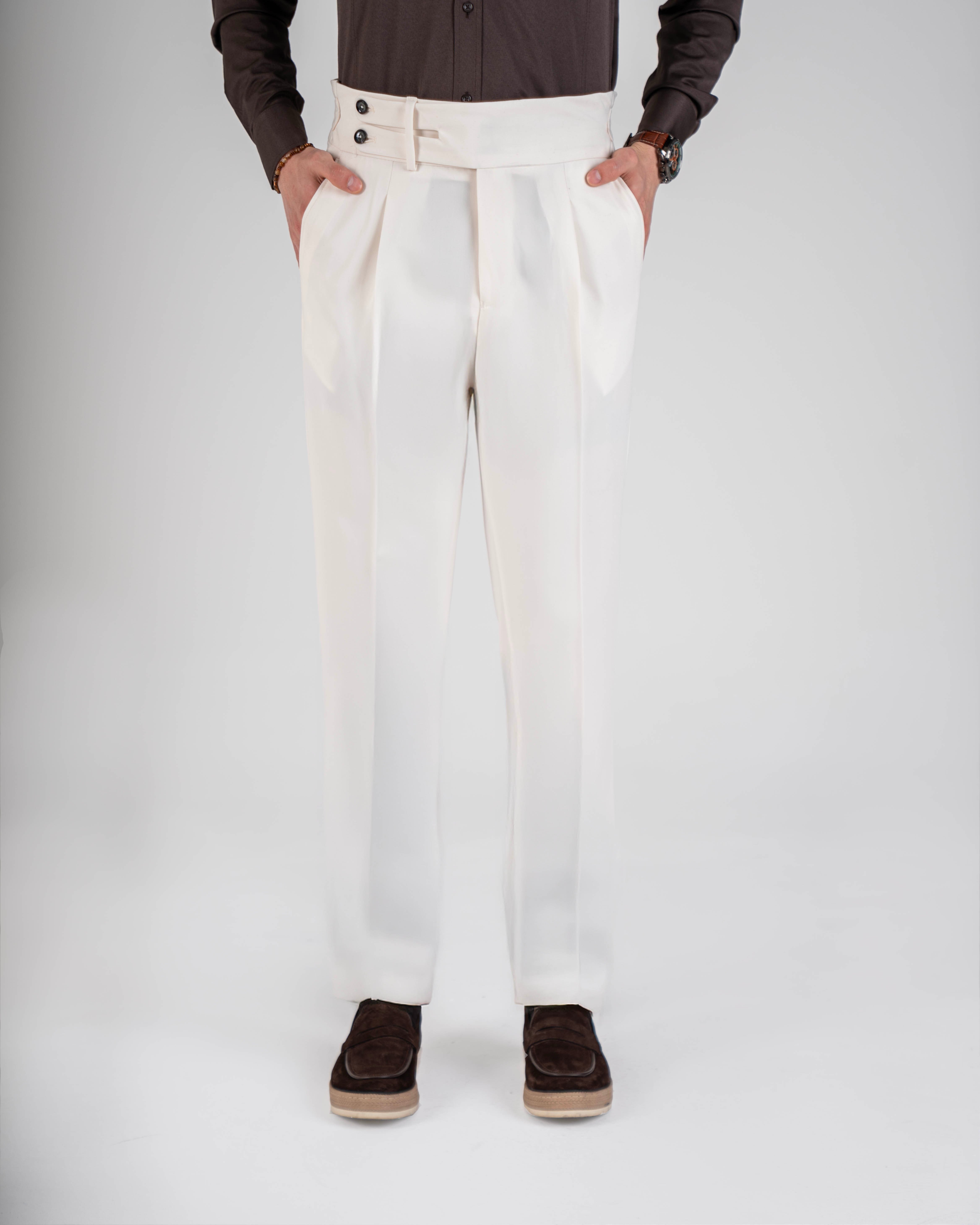 İtalyan stil slim fit erkek bel detaylı tokalı pantolon ekru T20037-05