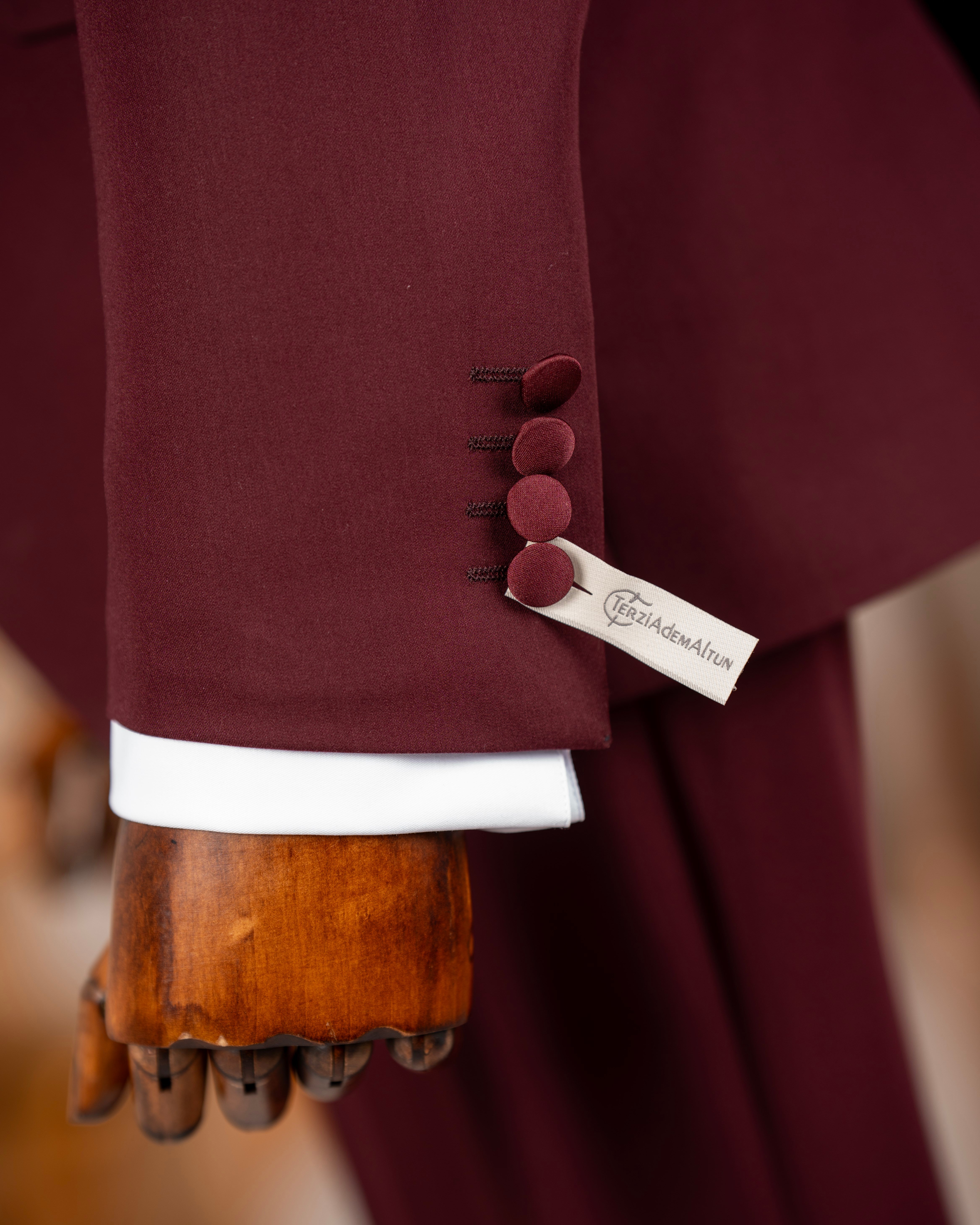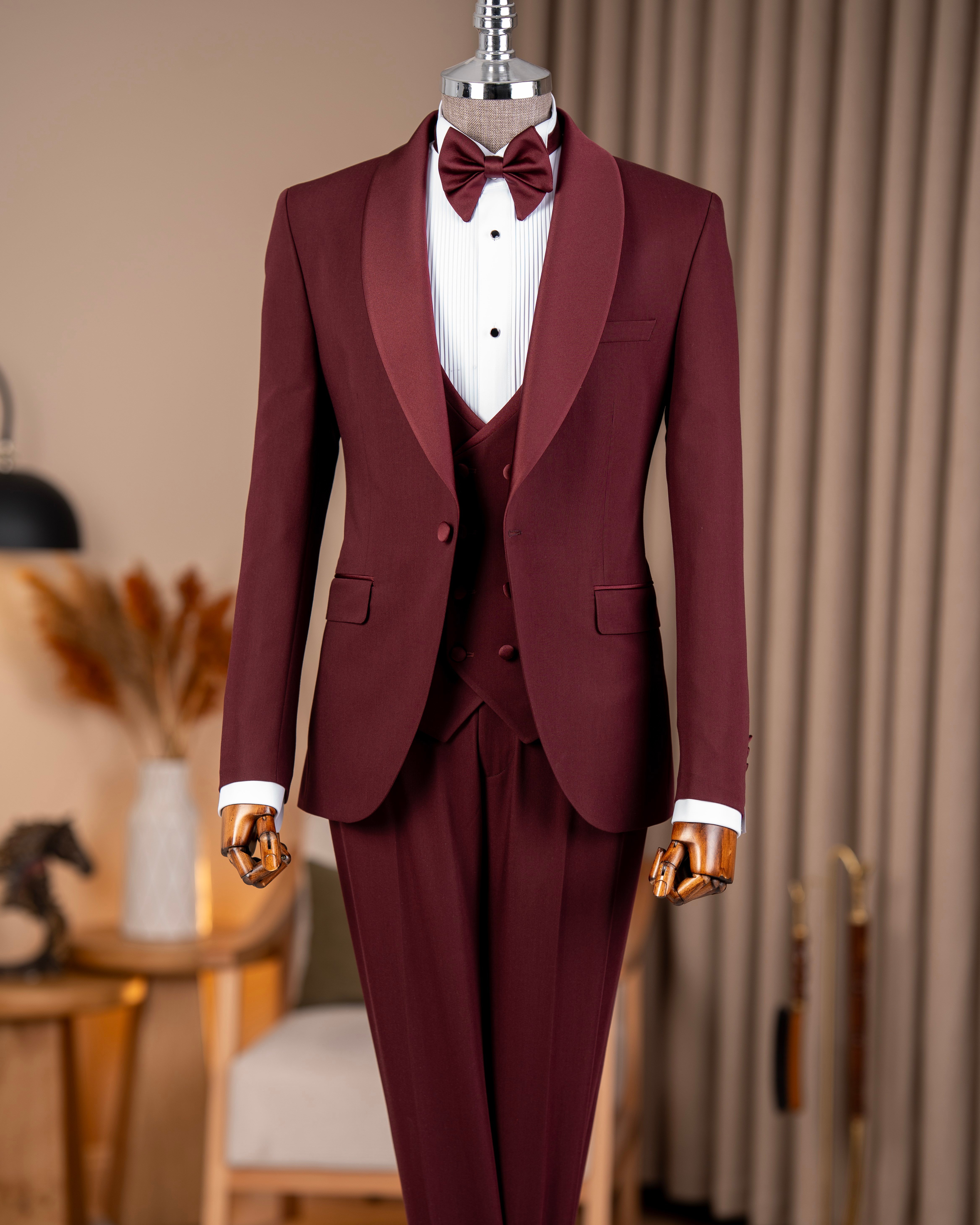 İtalyan stil slim fit erkek şal yaka ceket yelek pantolon damatlık set bordo T20067-10