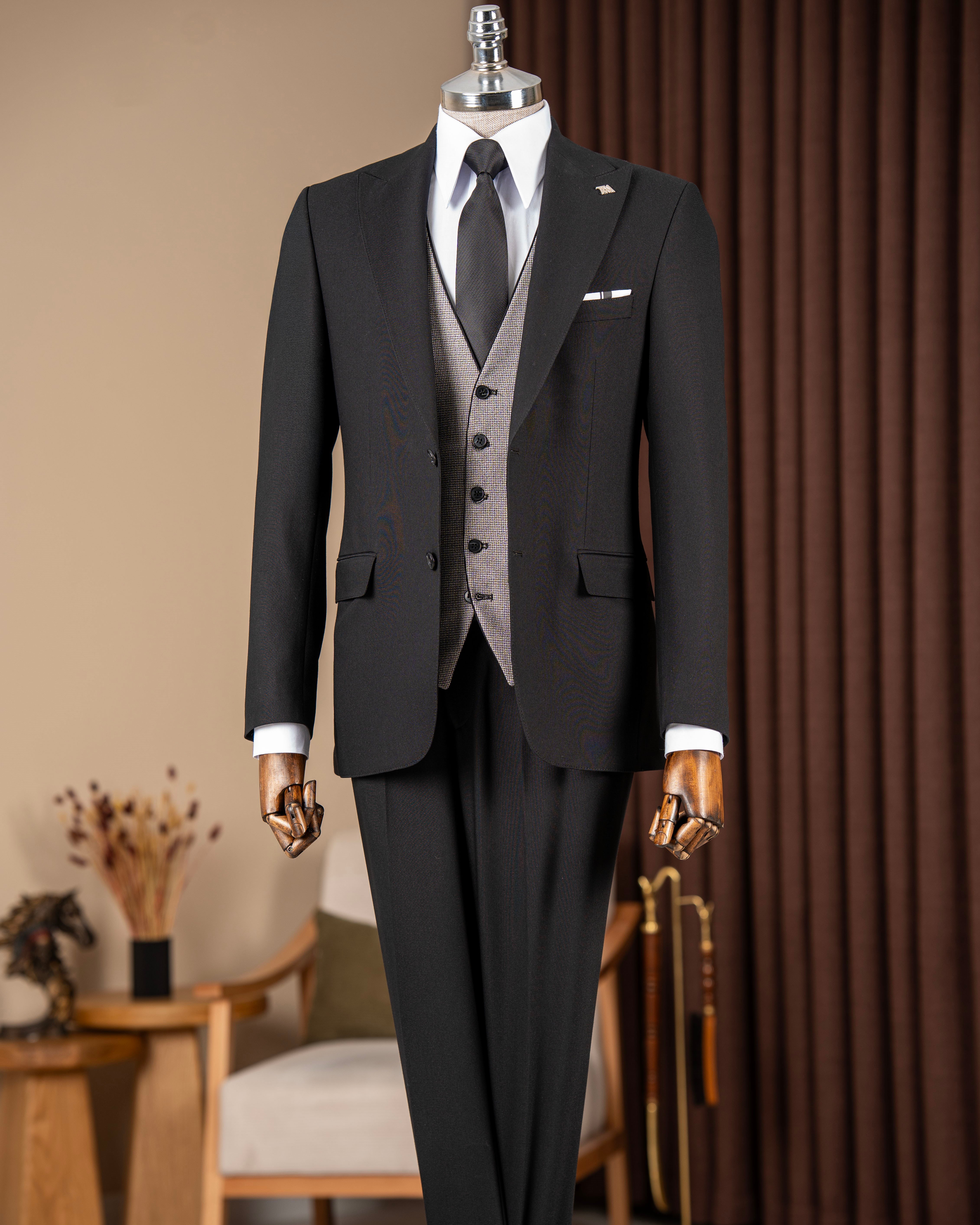 İtalyan stil erkek çift taraflı ceket yelek pantolon takım elbise siyah T20063-01