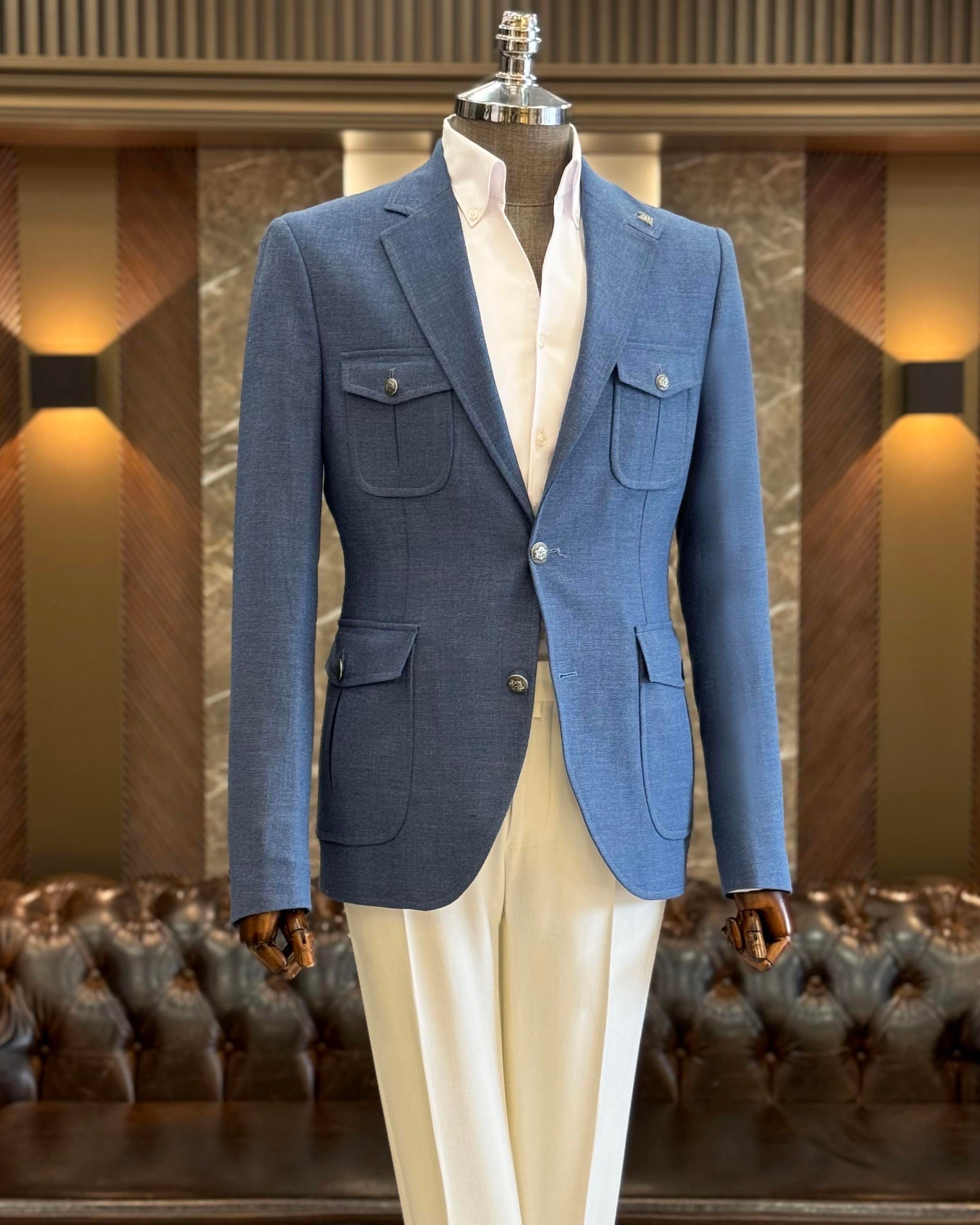 İtalyan stil erkek slim fit keten karışımlı safari ceket mavi T11990
