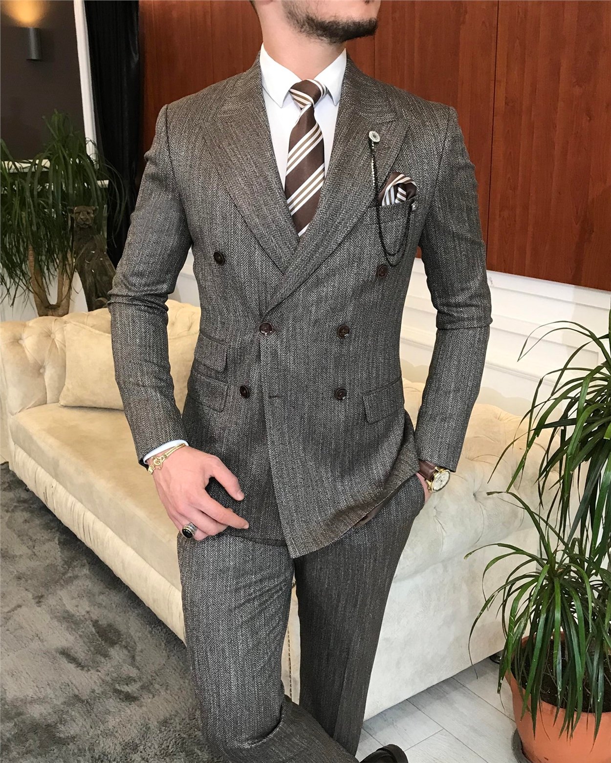 İtalyan stil kruvaze ceket pantolon takım elbise Kahverengi T6757