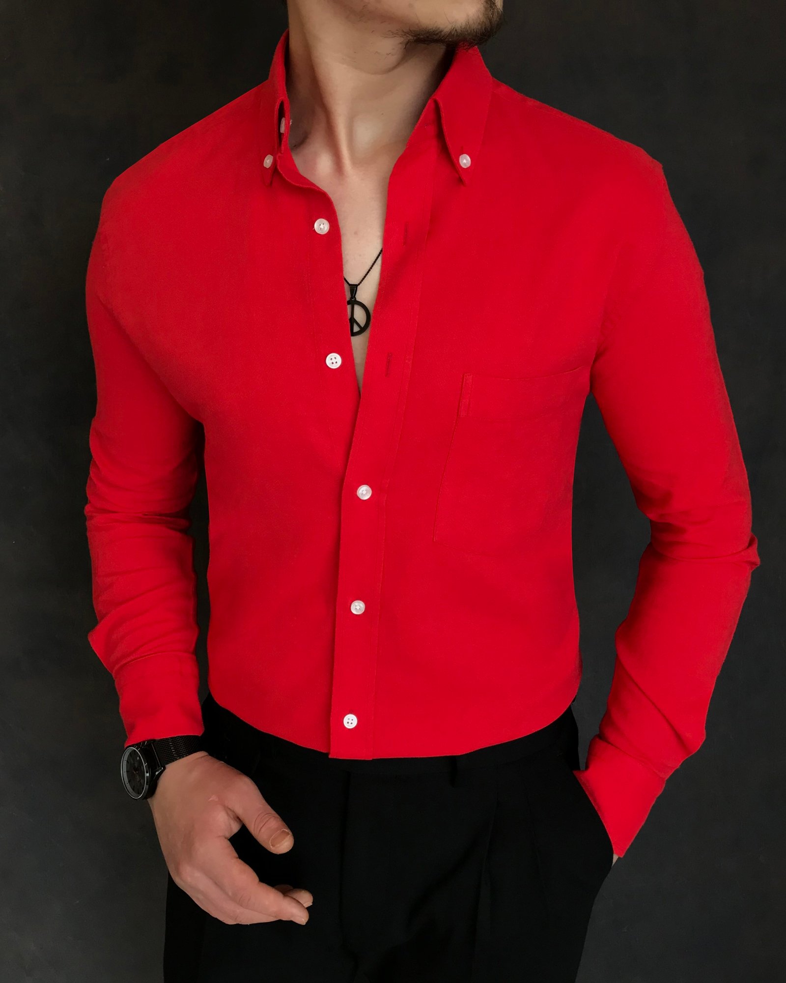 italyan stil slim fit dik yaka organik saf keten erkek gömlek kırmızı T5944