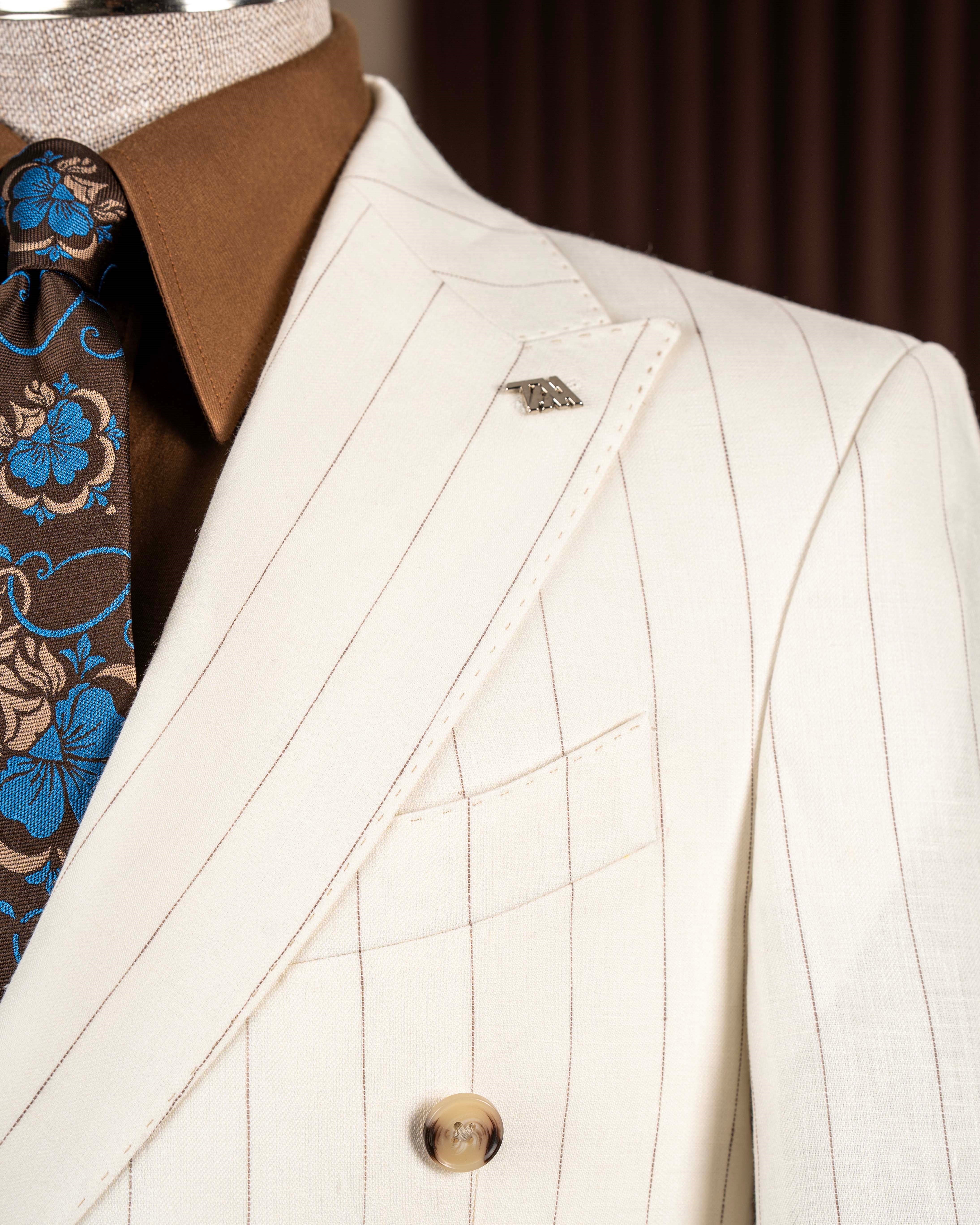 Slim fit erkek kruvaze sivri yaka çizgili keten ceket pantolon takım elbise ekru T20100-05